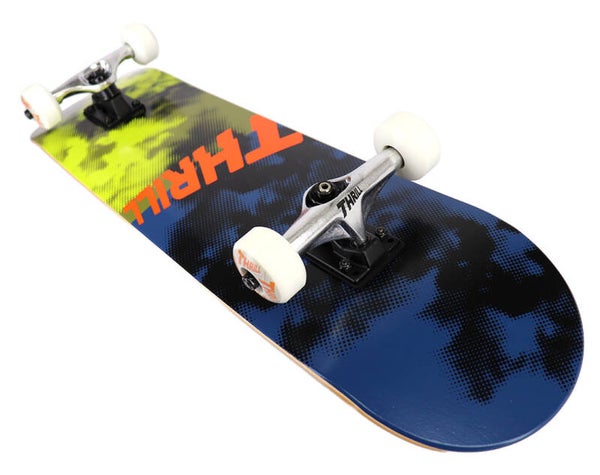 Die Thrill Komplettboards werden mit einem Deck aus 7 Schichten feinstem Ahornholz gefertigt, dass mit fettem Pop überzeugt. Die Grindmaster Achsen sind hochwertig und kommen mit Hollow Kingpins und mittelharten USA-made Bushings (95a). Das fährt sich smooth und hält richtig was aus.Auf harten Rollen in 100a kann das Board beim Street Skaten oder auch auf Rampen mächtig Spaß bringen. Die Komponenten sind perfekt auf die jeweilige Breite des Boards abgestimmt, um das bestmögliche Setup zu erhalten.